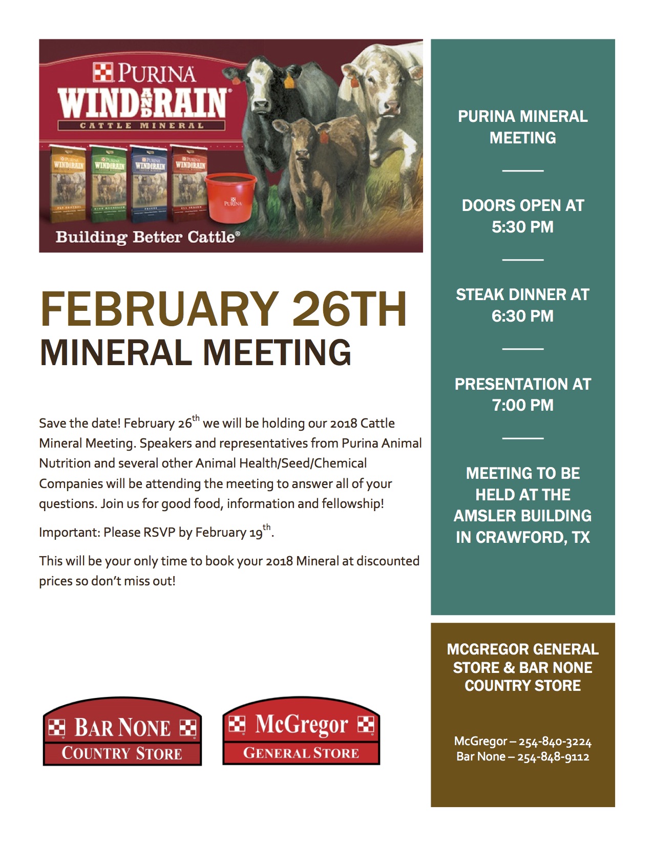 Cattle owners, the 2018 date for our annual Cattle Mineral Meeting at The Amsler Building, 6735 Avenue G, Crawford, TX 76657 is Monday, February 26, 2018.  We loved using this fabulous space for last year’s meeting, so we are doing it again. Join us for good food, a steak dinner, important information and fellowship. Speakers and representatives from Purina Animal Nutrition, and other great vendors will be in attendance.