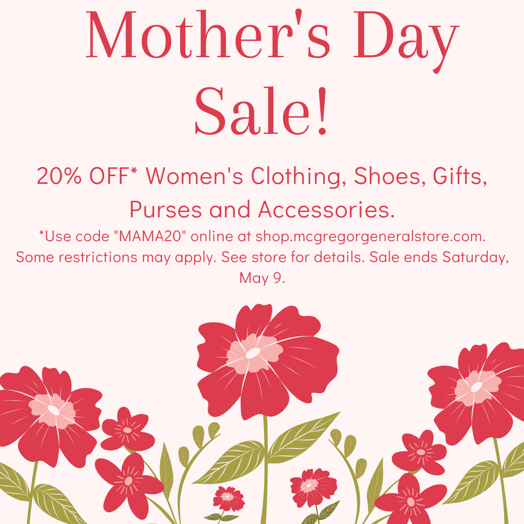 Monday, May 4 thru Saturday, May 9! You are sure to find something mom will love. Save 20% off women's clothing, shoes, gifts, purses and accessories. Some restrictions may apply. See store for details. Use code "mama20" online at shop.mcgregorgeneralstore.com. PLEASE NOTE: If you choose "Store Pickup" as your shipping option, it will be held [...]