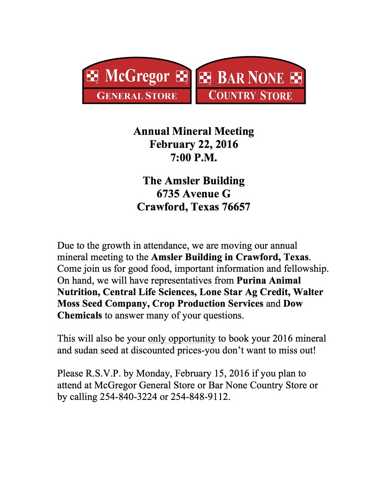 Cattle owners, save this date, Monday, February 22 at 7:00pm for our annual Cattle Mineral Meeting at The Amsler Building, 6735 Avenue G, Crawford, TX 76657. Please note, this is a NEW location due to the growth in attendance over the last few years! We just can’t comfortably fit everyone in one of our stores anymore. Join us for good food, important information and fellowship. Speakers and representatives from Purina Animal Nutrition, Central Life Sciences, Lone Star Ag Credit, Walter Moss Seed Company, Crop Production Services and Dow Chemicals will be on hand to answer your questions.