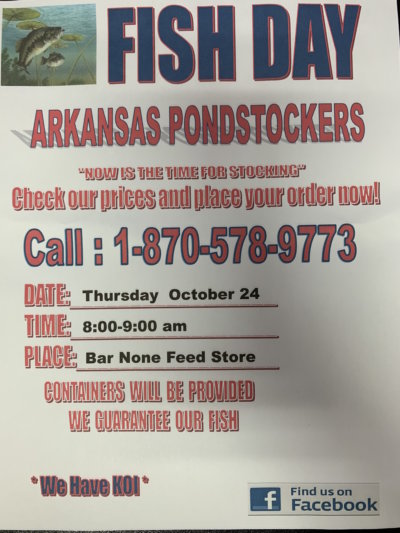 Restock your pond on Thursday, October 24, 8:00 – 9:00am at Bar None Country Store. The fish truck from Arkansas Pondstockers will be rolling into our parking lot.